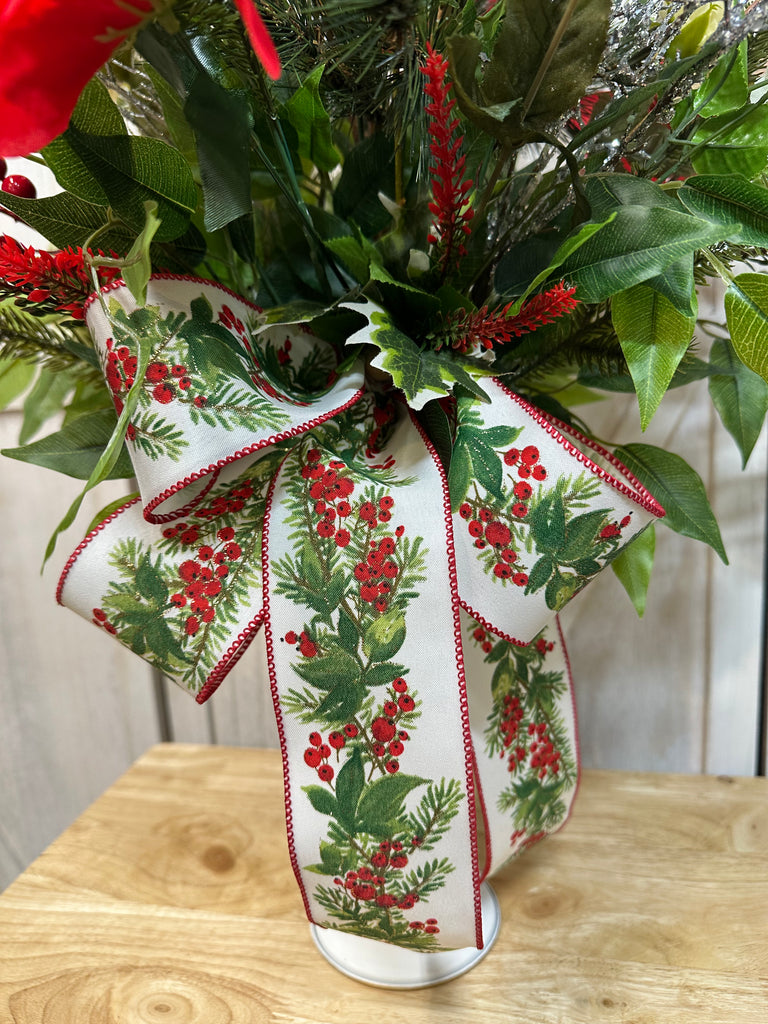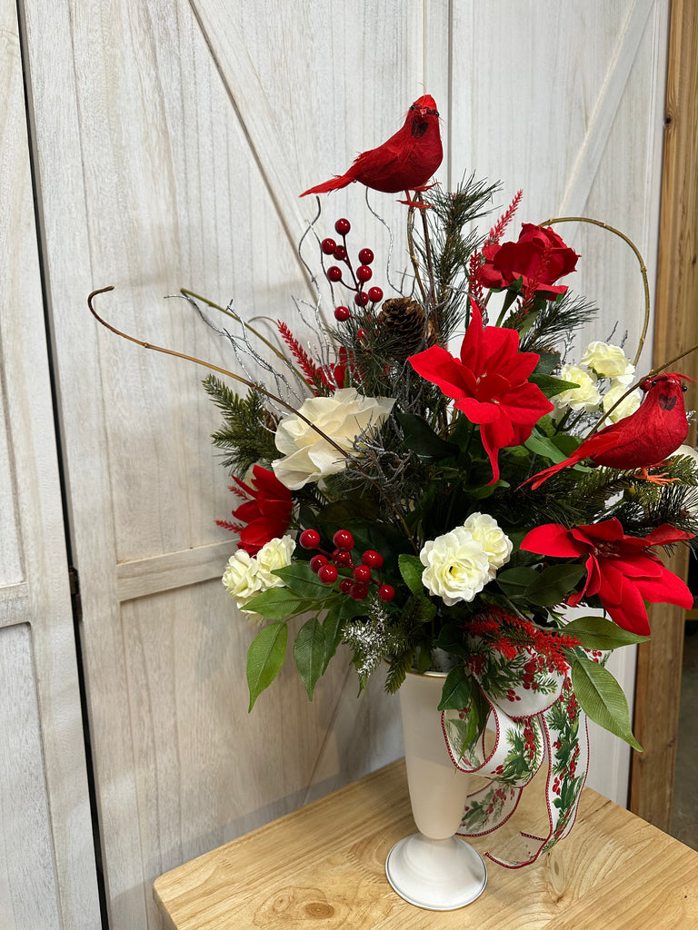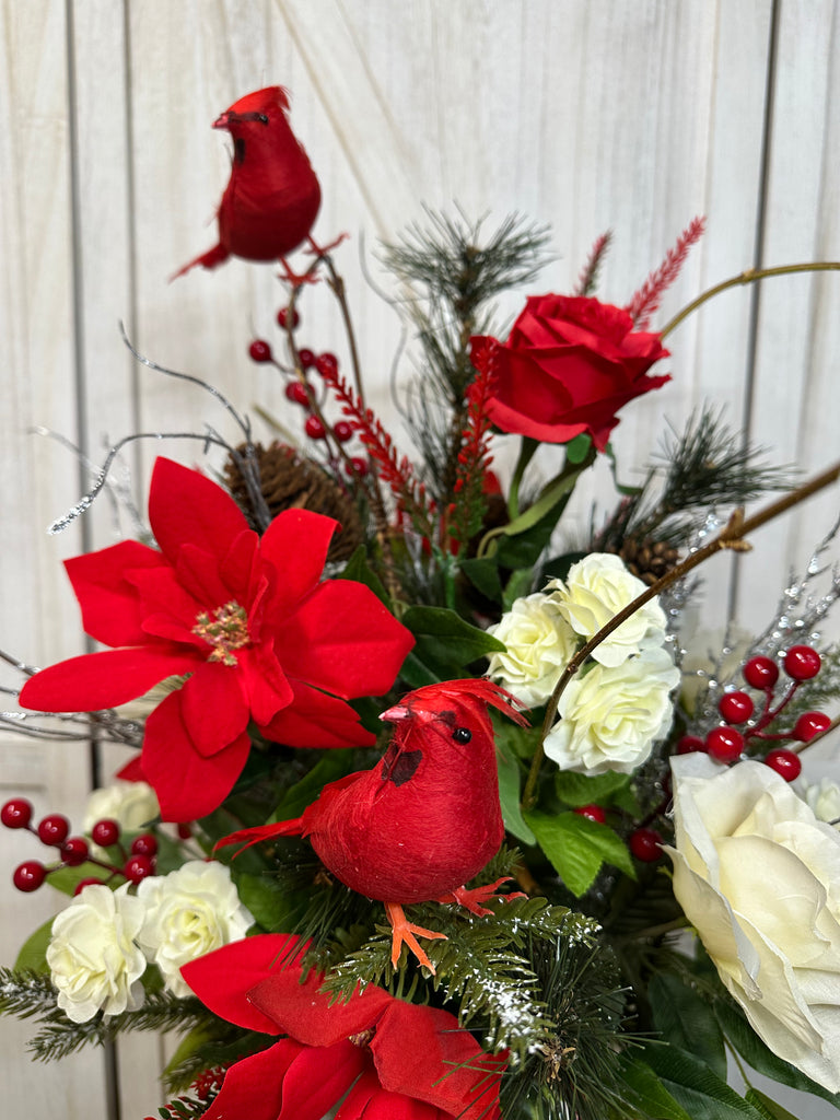 Bright arrangement full of tradition Christmas colors and textures. Design is made a foam cone shaped form.  Design includes pine and mixed greenery, poinsettia, flocked or glittered greenery or branches, bright red berries, and pinecones. Complete this design with two white doves or red cardinals and a ribbon bow in coordinated Christmas print.