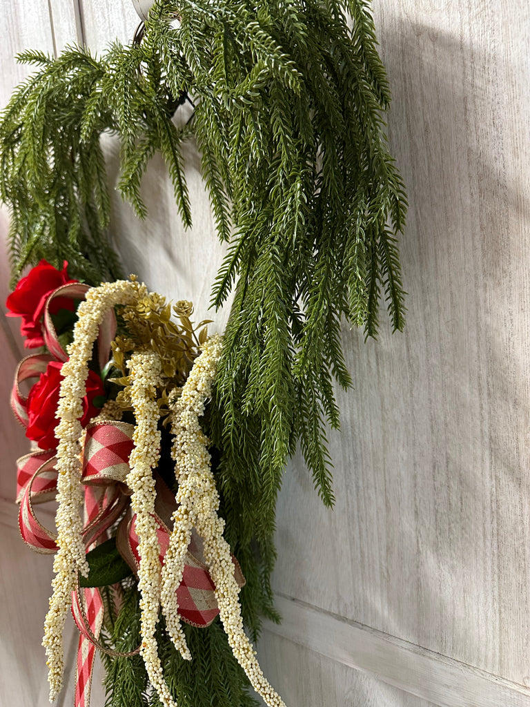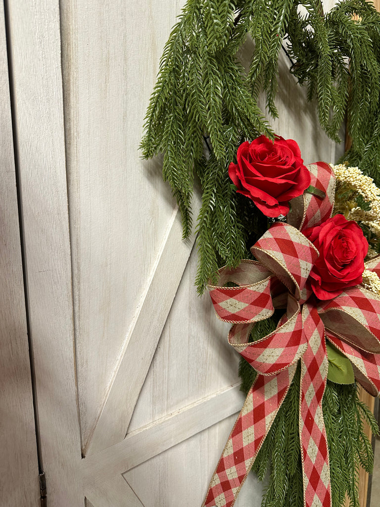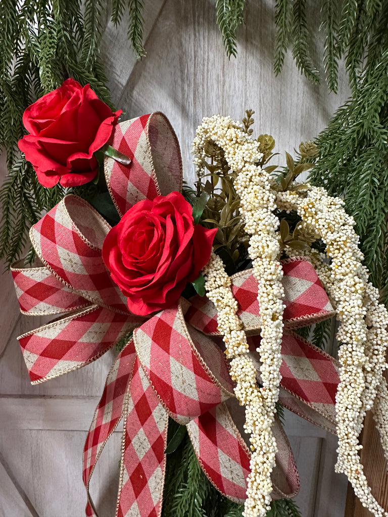 This Heart Valentines wreath is designed on a heart shaped wire form with draping north pine evergreen, roses, amaranthus and plaid ribbon bow.