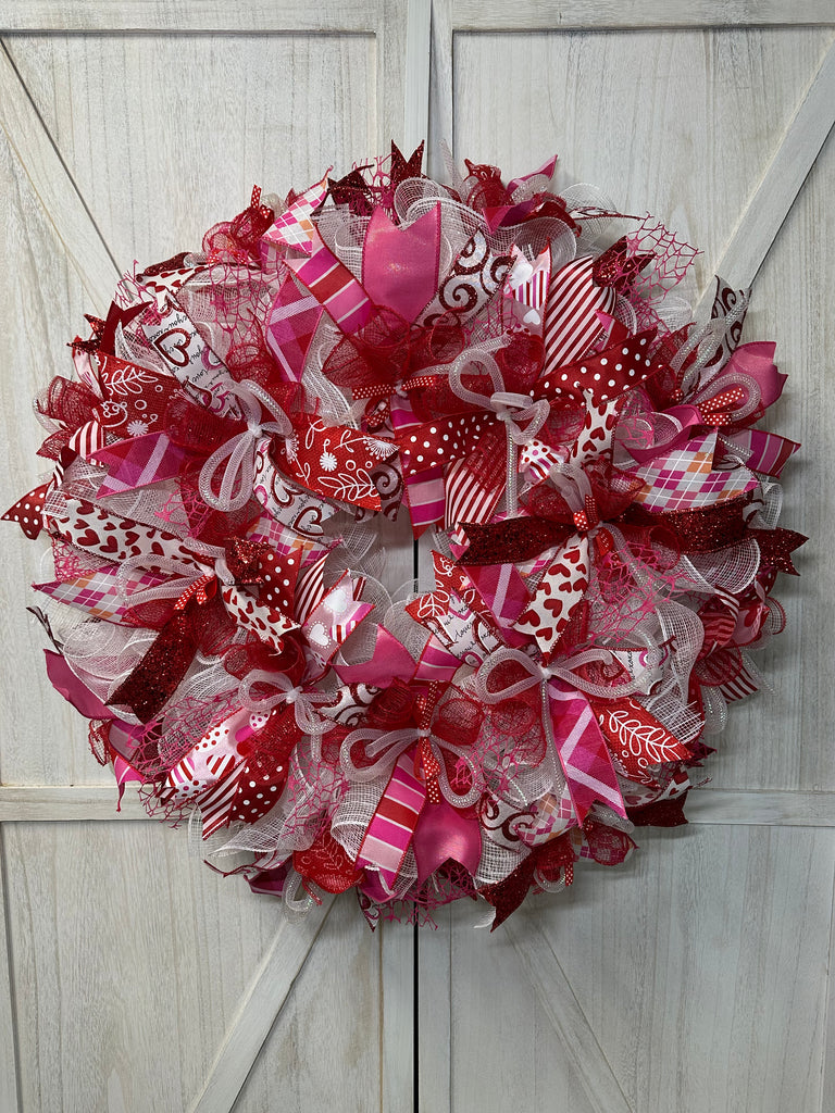 Fluffy festive Valentine's or Mother's Day theme wreath designed on a wire form with mesh, 48 ribbon tails with mixed patterns, pink, red and white iridescent mesh tubing and mini polka dot bows.