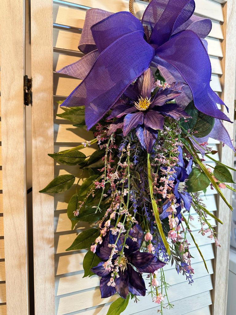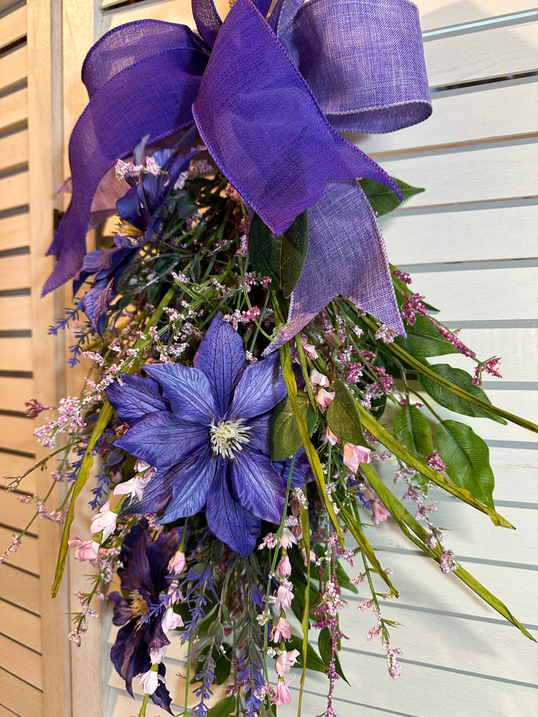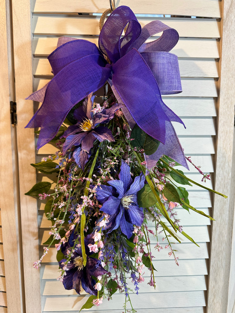 Floral Teardrop Swag designed with various seasonal colored florals, greenery, branches and accented with a burlap or plaid ribbon bow. Hangs by a burlap wrapped hanger.